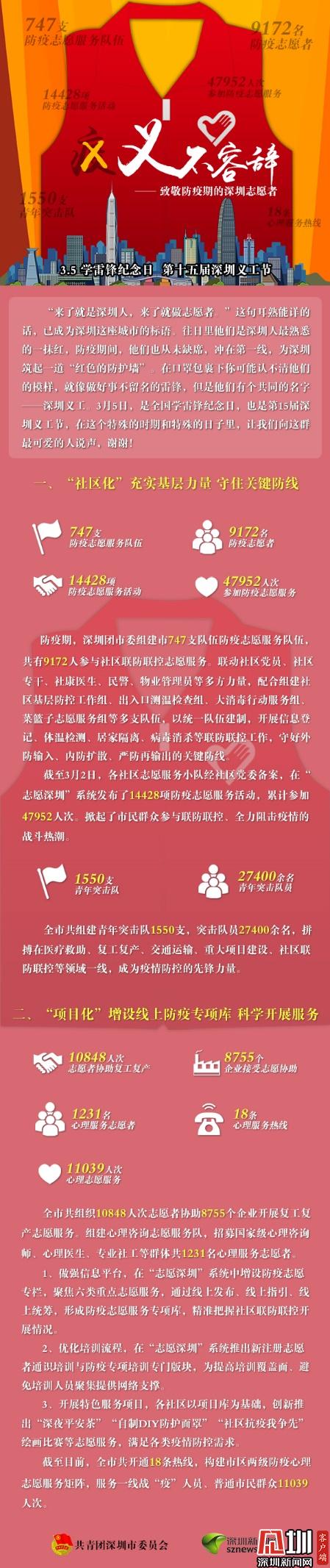 據了解,防疫期間,深圳團市委組建747支防疫志愿服務隊伍,共9172人參與社區(qū)聯防聯控志愿服。截至3月2日,各社區(qū)志愿服務小隊經社區(qū)黨委備案,在“志愿深圳”系統(tǒng)發(fā)布了14428項防疫志愿服務活動,累計參加47952人次。在深圳戰(zhàn)“疫”的關鍵時刻,全市共組建青年突擊隊1550支,突擊隊員27400余人,拼搏在醫(yī)療救助、復工復產、交通運輸、重大項目建設、社區(qū)聯防聯控等領域一線,成為疫情防控的先鋒力量。