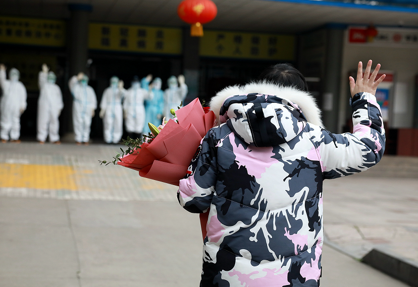 不一會兒,7名穿著防護服的醫(yī)護人員將張冬雪護送了出來。剛一露面,人群中立刻響起一陣掌聲。2位早已在大門外等候的護士激動地上前與張冬雪擁抱,段昌奉也沖上去把飽含大家祝福和關(guān)心的鮮花獻給她。張冬雪笑著向人群揮手,走了幾步后,又回頭向依然站在門口目送她的7名醫(yī)護人員深深鞠了一躬,“謝謝,謝謝你們?!?/p>