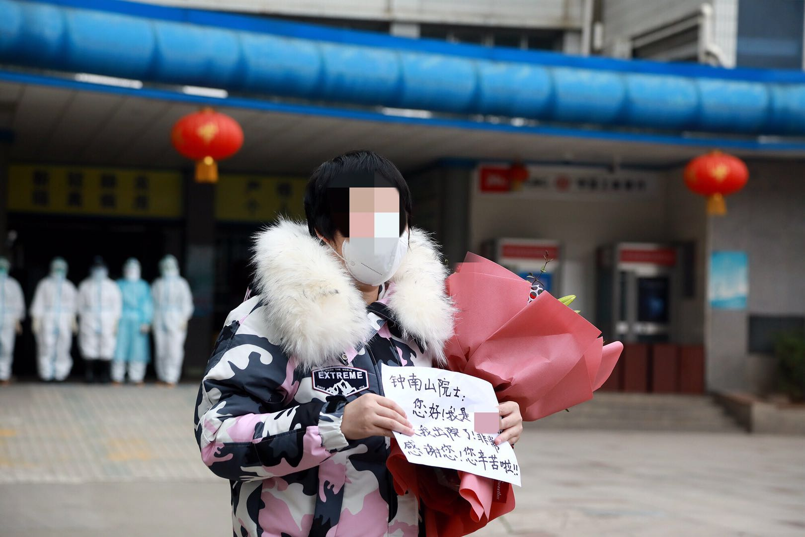 張冬雪走近后,面對記者的鏡頭,打開自己事先準備好的一張紙,上面寫著“鐘南山院士,您好,今天我出院了,非常感謝您,您辛苦啦!”