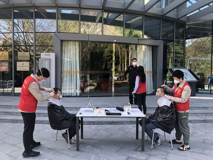 公司本部,1303會議室,臨時理發(fā)室“生意”也火爆極了。公司工會邀請了兩名專業(yè)的Tony老師,為近90名員工提供免費的理發(fā)服務(wù)。為減少人員聚集,理發(fā)采取提前線上預(yù)約,分時段進行,確保安全的同時,盡可能讓有需要的同事都能理上發(fā)。鋪上一次性地毯,坐上椅子,圍上一次性“斗篷”,Tony老師一頓熟練的剪發(fā)操作后,再用吹風(fēng)機整好造型,就完成了理發(fā)的全過程。臨時理發(fā)師的搭建,有效解決了員工生活上的困難,幫助他們以良好的精神面貌投入工作來。