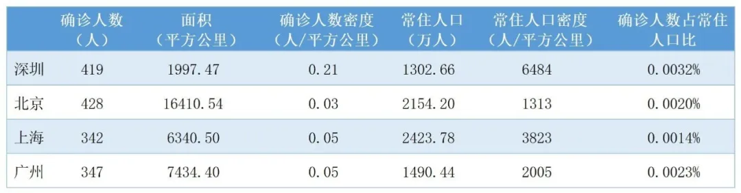 ▲深圳常住人口密度大,人員流動(dòng)頻繁,疫情防控難度高,導(dǎo)致確診人數(shù)在北、上、廣、深四大城市中最多,分布密度位也居首位,對(duì)防控工作形成巨大壓力。