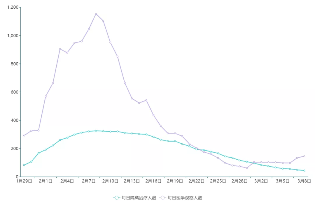 ▲2月7日起,每日新增確診病例數(shù)保持在較低水平。2月18日至3月5日,深圳僅新增兩例(均為境外輸入型病例)。這一方面是由于國(guó)內(nèi)疫情發(fā)生地采取封閉措施后,輸入型病例不斷減少;另一方面基層疫情防控工作取得較好成效,病毒本地傳播被有效阻斷。