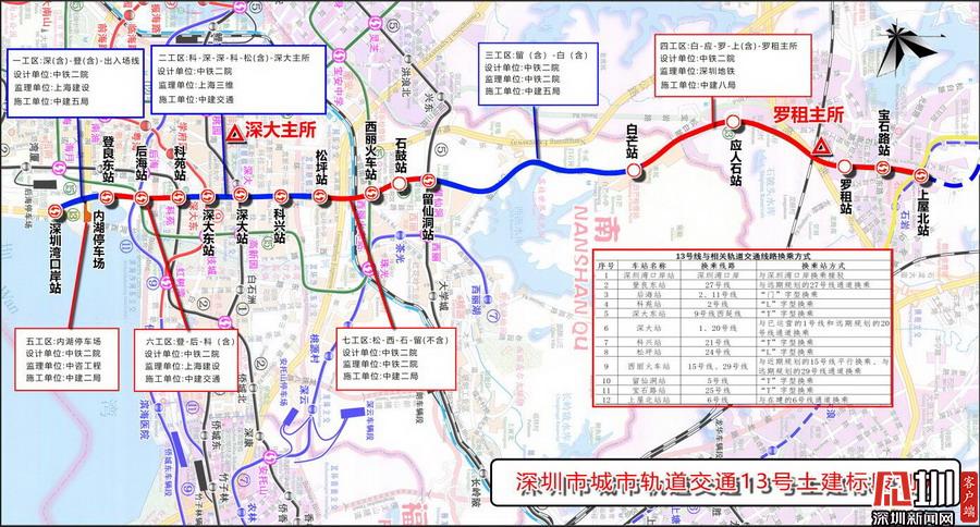 據(jù)了解,地鐵13號(hào)線由南至北穿過(guò)南山區(qū)、寶安區(qū)和光明新區(qū)。項(xiàng)目共設(shè)車站16座,線路總長(zhǎng)22.436公里,出入線與后海站接軌,將穿越已運(yùn)營(yíng)的地鐵1號(hào)線、2號(hào)線、5號(hào)線、11號(hào)線。由于沿途工程地質(zhì)條件復(fù)雜、換乘站多、工程實(shí)施難度大、長(zhǎng)區(qū)間盾構(gòu)、拆遷工作繁重、交通疏解復(fù)雜等原因,13號(hào)線被稱為深圳地鐵建設(shè)史上最難的地鐵線路之一。