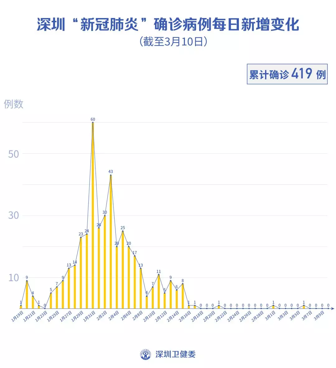 截至3月10日24時,深圳累計報告“新冠肺炎”確診病例419例。3月10日當(dāng)天全市無新增確診病例,當(dāng)天出院病例6例(從2月26日起不再公布出院個案)。