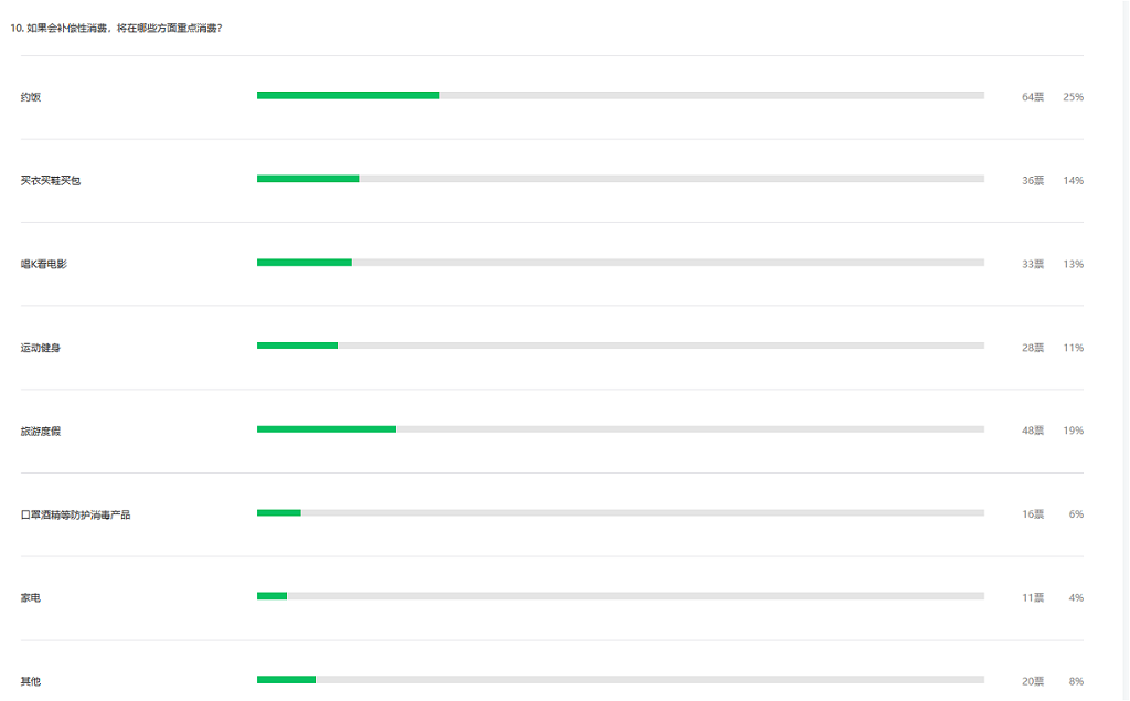 整體看,疫情對深圳市民總體消費意愿有影響。調(diào)查顯示,近四成受訪者表示疫情結(jié)束后會有補償性消費,約飯、旅游度假、買衣買鞋買包、唱K看電影以及運動健身成為疫情過后補償性消費的五大主要領域。