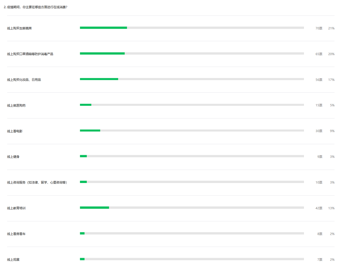 雖然有56%的市民表示對“在線消費”的商品質(zhì)量和服務評價滿意度下降,但是市民的原有生活習慣卻在潛移默化中改變了,超一半的市民表示喜歡“在線消費”,疫情結(jié)束后,會提高“在線消費”在日常開銷中的比例。特別是會加強生鮮蔬菜、口罩酒精、化妝日用品的購買頻率,也會更常使用網(wǎng)絡進行教育培訓、就醫(yī)購藥、法律咨詢、看房看車等。