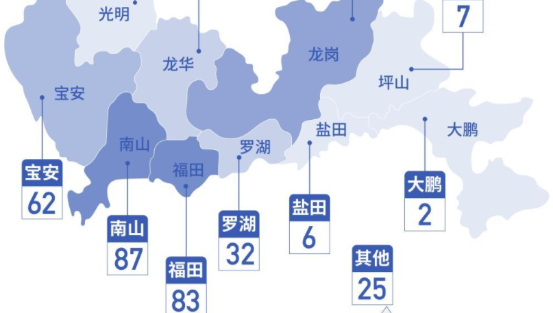 按照病例管理地區(qū)劃分,南山區(qū)87例、福田區(qū)83例、龍崗區(qū)71例、寶安區(qū)62例、龍華區(qū)34例、羅湖區(qū)32例、光明區(qū)11例、坪山區(qū)7例、鹽田區(qū)6例、大鵬新區(qū)2例、其他(指由機場、車站、碼頭、關(guān)口、路卡等直接送往定點醫(yī)院的)26例。