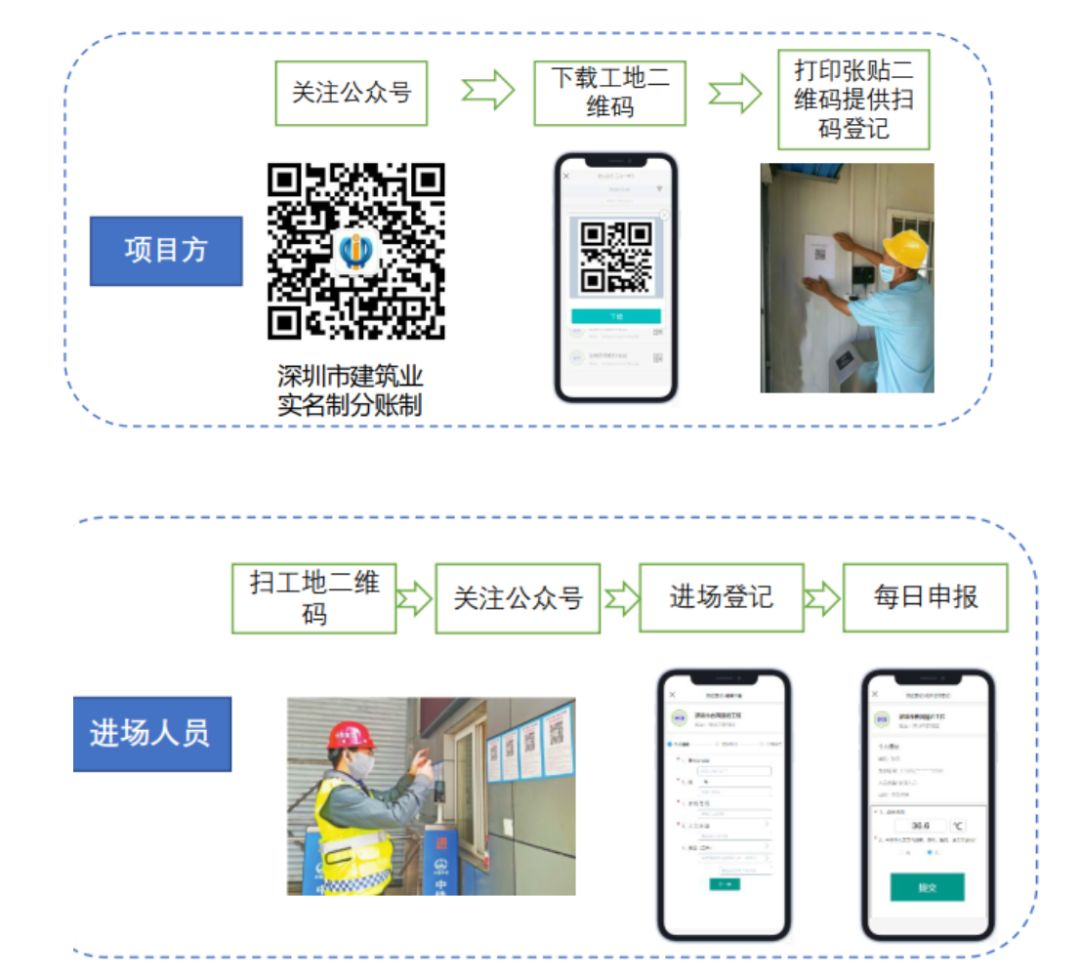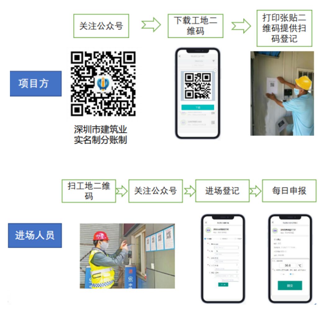 市場建設(shè)單位應(yīng)關(guān)注深圳市建筑業(yè)實(shí)名制分賬制微信公眾號(hào),獲取本工地的微信二維碼,并將工地二維碼張貼至工地公示區(qū)域。施工人員每日進(jìn)場前測溫后,掃碼申報(bào)個(gè)人測溫結(jié)果和健康狀況。