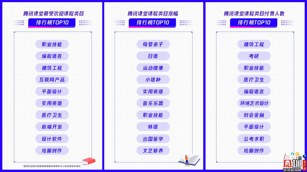 見圳客戶端·深圳新聞網(wǎng)2020年3月18日訊(見圳客戶端、深圳新聞網(wǎng)記者 劉夢婷)近日,在線職業(yè)教育平臺騰訊課堂發(fā)布數(shù)據(jù)報告:戰(zhàn)“疫”宅家期間,該平臺上課總時長提升3.5倍。同時,騰訊課堂還發(fā)布了最受歡迎課程類目(學(xué)習(xí)人數(shù))排行榜TOP10:職業(yè)技能、編程語言、建筑工程、互聯(lián)網(wǎng)產(chǎn)品、平面設(shè)計、實用英語、醫(yī)療衛(wèi)生、前端開發(fā)、設(shè)計軟件、繪畫創(chuàng)作。此外母嬰親子、日語、運動健康等課程學(xué)習(xí)人數(shù)同比漲幅均超過400%,成騰訊課堂增速最快類目,或成為未來在線職業(yè)教育新的增長點。IT互聯(lián)網(wǎng)就業(yè)類課程、工業(yè)產(chǎn)品設(shè)計類課程付費能力強,付費人數(shù)同比漲幅超過50%。