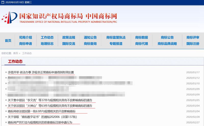 從2月27日到3月17日,商標局工作動態(tài)有5條和涉疫非正常商標申請有關(guān)(劃紅線處)