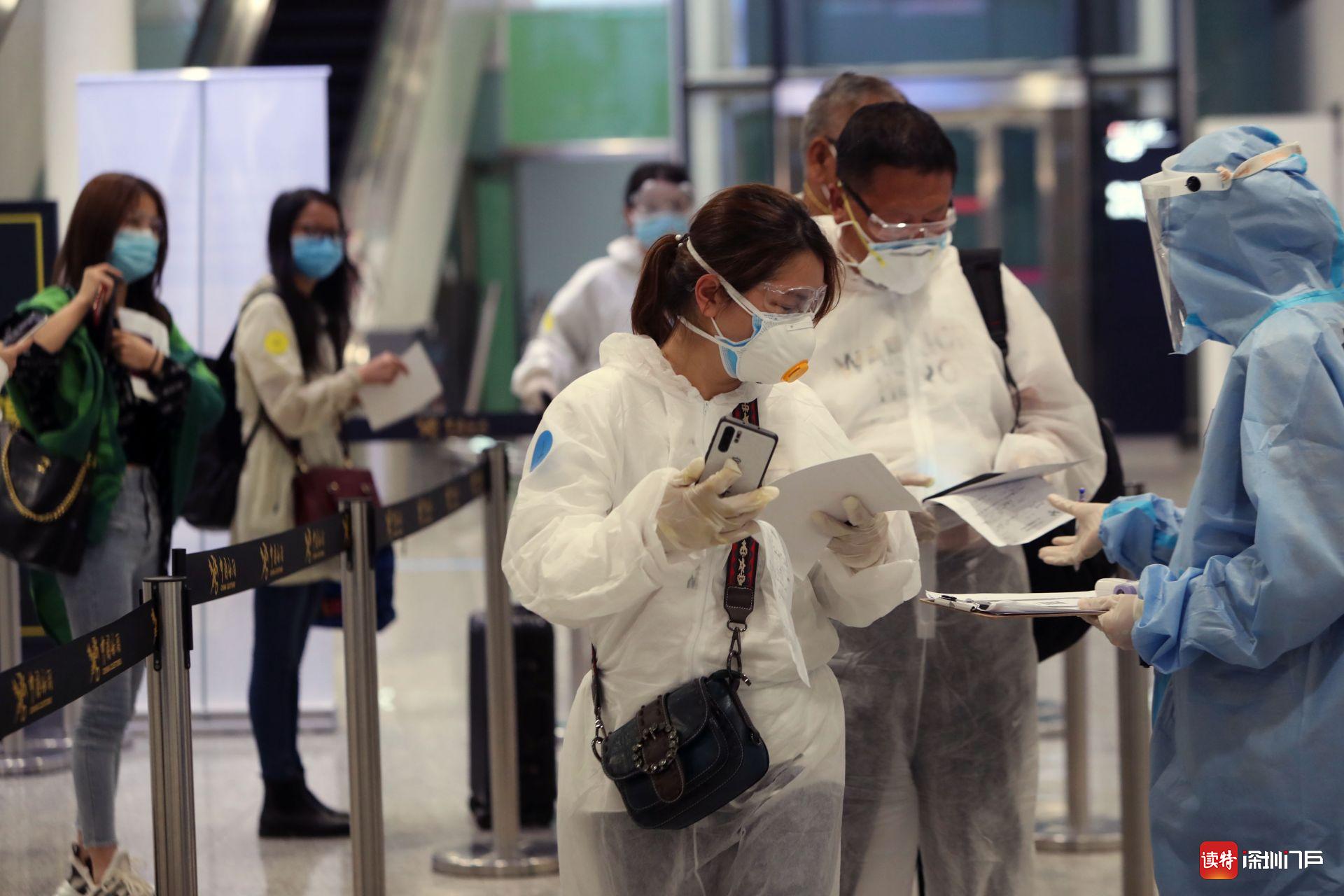 現(xiàn)場關(guān)員一一核對健康申報卡,并仔細詢問旅客過去旅居史,同時手持測溫儀對每一個旅客進行測溫,監(jiān)測體溫情況。