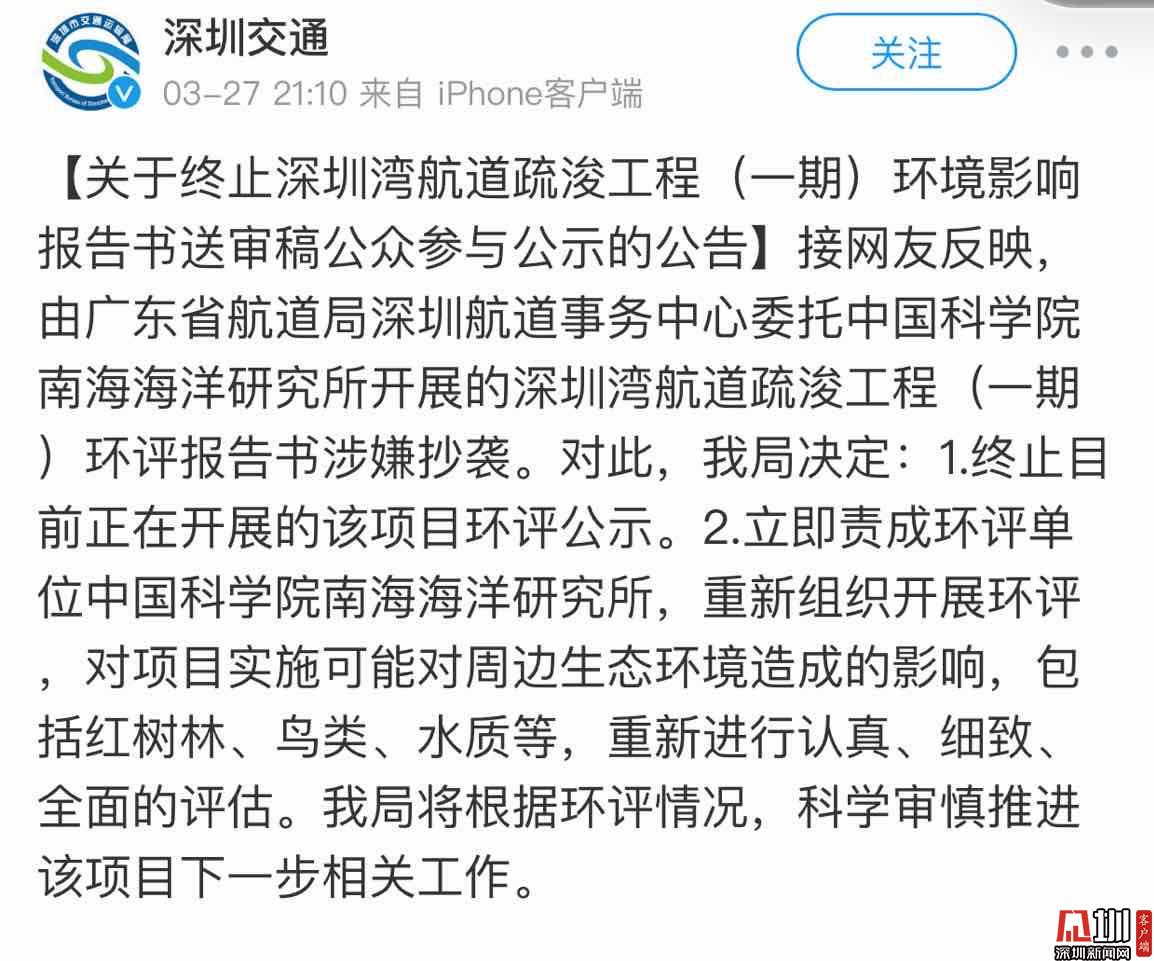 3月27日21時10分,深圳市交通運輸管理局官方微博發(fā)布消息稱:接網(wǎng)友反映,由廣東省航道局深圳航道事務中心委托中國科學院南海海洋研究所開展的深圳灣航道疏浚工程(一期)環(huán)評報告書涉嫌抄襲。對此,深圳市交通運輸管理局決定:1.終止目前正在開展的該項目環(huán)評公示。2.立即責成環(huán)評單位中國科學院南海海洋研究所,重新組織開展環(huán)評,對項目實施可能對周邊生態(tài)環(huán)境造成的影響,包括紅樹林、鳥類、水質等,重新進行認真、細致、全面的評估。深圳市交通運輸管理局將根據(jù)環(huán)評情況,科學審慎推進該項目下一步相關工作。