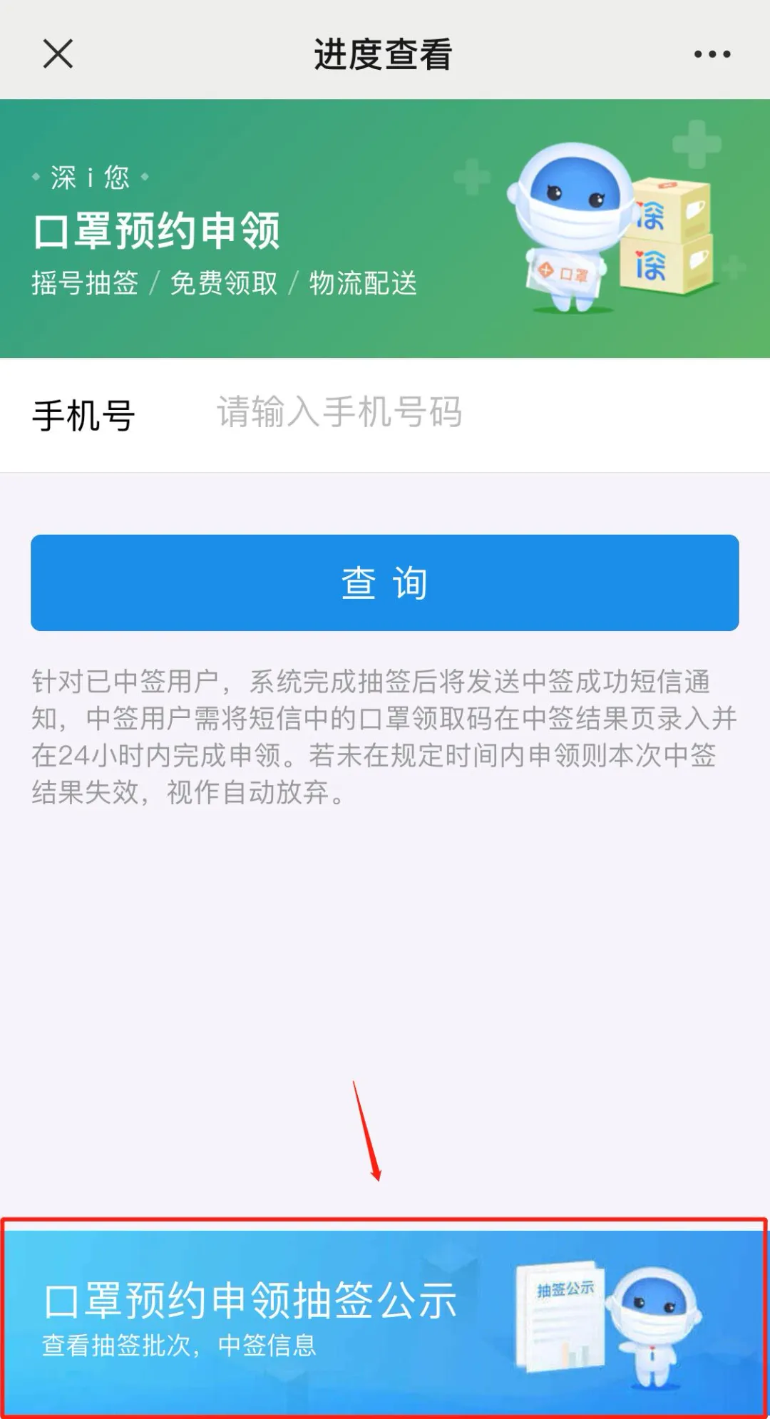 個人中簽名單:可在“i深圳”微信公眾號首頁-口罩預約-市民專區(qū)-進度查看的頁面下方“口罩預約申領抽簽公示”查看