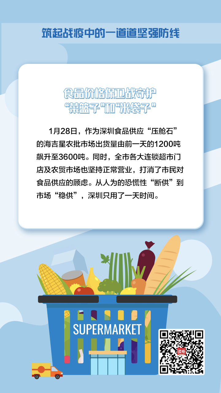 “食品價格保衛(wèi)戰(zhàn)”第一槍在1月27日打響。當天,市菜籃子工程領導小組召集各大商超市場責任人開會,制定詳細的作戰(zhàn)計劃。1月28日,作為深圳食品供應“壓艙石”的海吉星農(nóng)批市場出貨量由前一天的1200噸飆升至3600噸。同時,全市各大連鎖超市門店及農(nóng)貿(mào)市場也堅持正常營業(yè),打消了市民對食品供應的顧慮。從人為的恐慌性“斷供”到市場“穩(wěn)供”,深圳只用了一天時間。