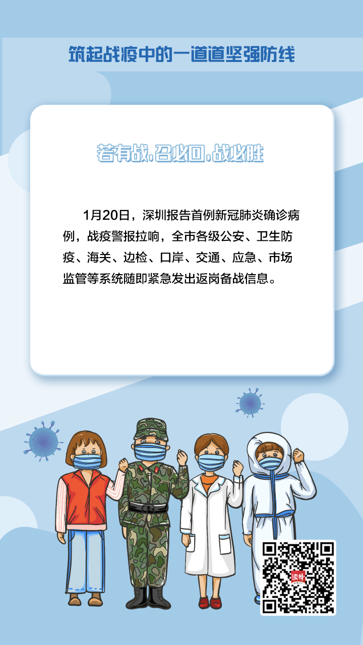 “在深圳的各位同事請立即返崗。各單位請馬上通知休假人員,落實人員歸隊?!?月20日,深圳報告首例新冠肺炎確診病例,戰(zhàn)疫警報拉響,全市各級公安、衛(wèi)生防疫、海關、邊檢、口岸、交通、應急、市場監(jiān)管等系統(tǒng)隨即緊急發(fā)出返崗備戰(zhàn)信息。