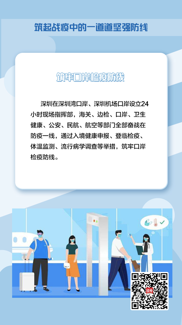 深圳在深圳灣口岸、深圳機場口岸設立24小時現(xiàn)場指揮部,海關、邊檢、口岸、衛(wèi)生健康、公安、民航、航空等部門全部奮戰(zhàn)在防疫一線,通過入境健康申報、登臨檢疫、體溫監(jiān)測、流行病學調(diào)查等舉措,筑牢口岸檢疫防線。