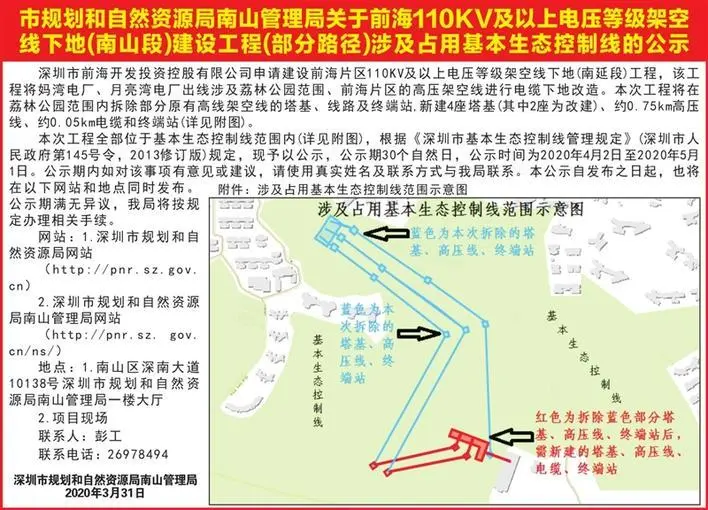 該工程將對媽灣電廠、月亮灣電廠出線,涉及荔林公園范圍、前海片區(qū)的高壓架空線,進(jìn)行電纜下地改造,荔林公園內(nèi)部分原有的高壓架空線的塔基、線路及終端站將會被拆除,將新建、改建各2座塔基。