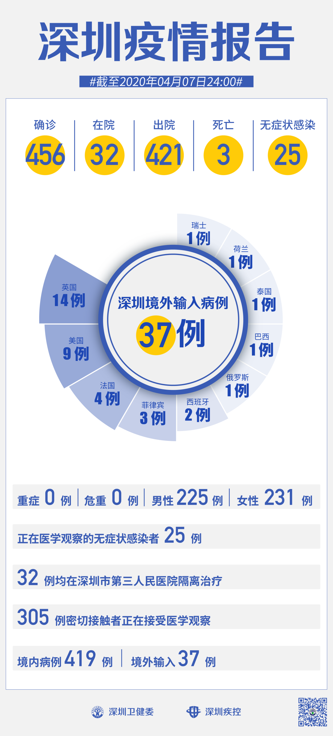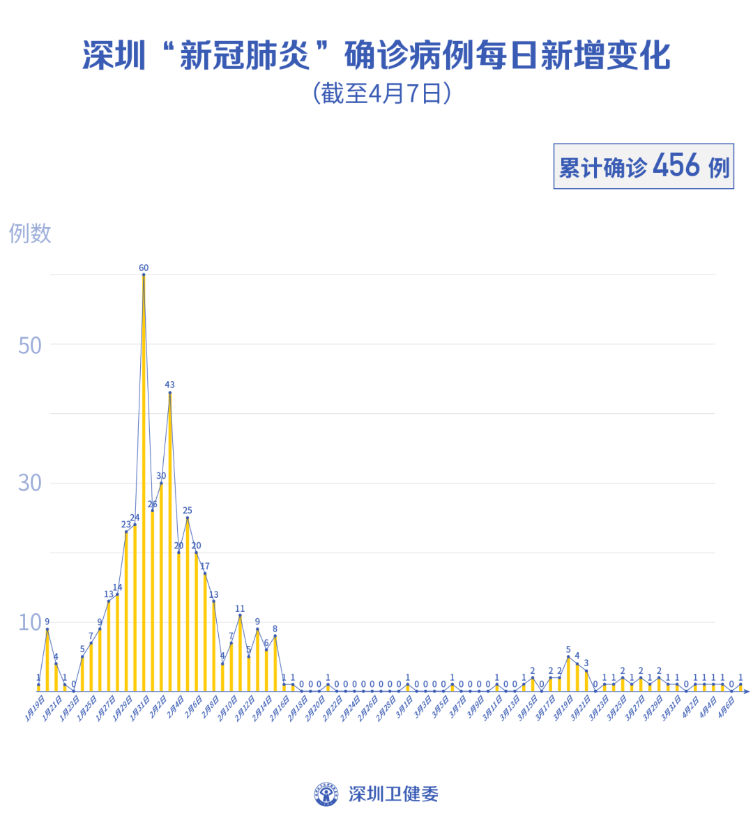 截至4月7日24時,深圳累計報告新冠肺炎病例456例。4月7日當天新增境外輸入病例1例,新增無癥狀感染者1例,出院1例。