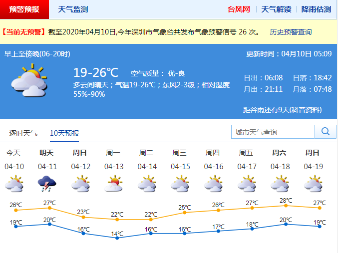 見圳客戶端·深圳新聞網2020年4月10日訊 連續(xù)多日的降雨終告一段落。9日我市多云可見陽光,多日不見的太陽終于回歸,白天氣溫攀升也十分明顯,最高氣溫達到25℃-27℃。