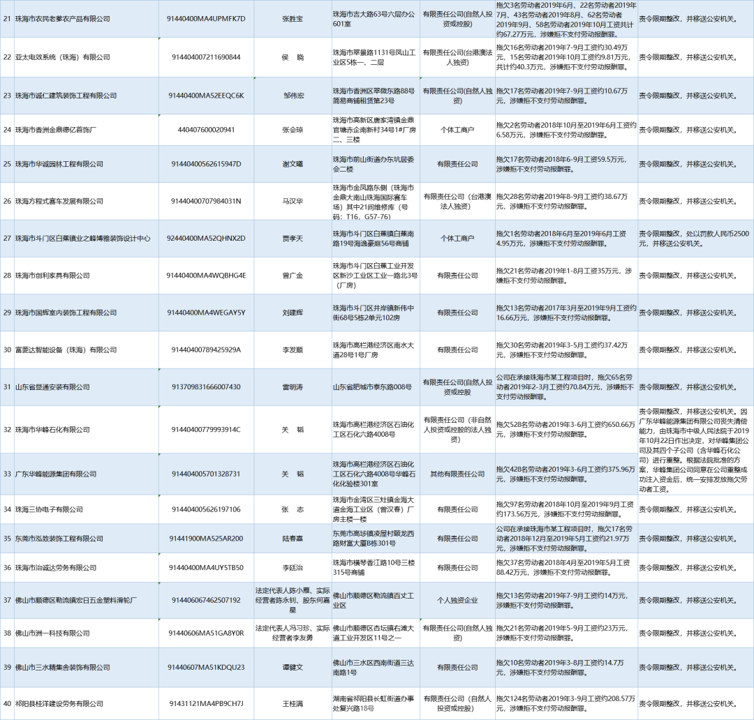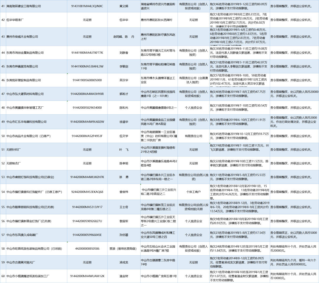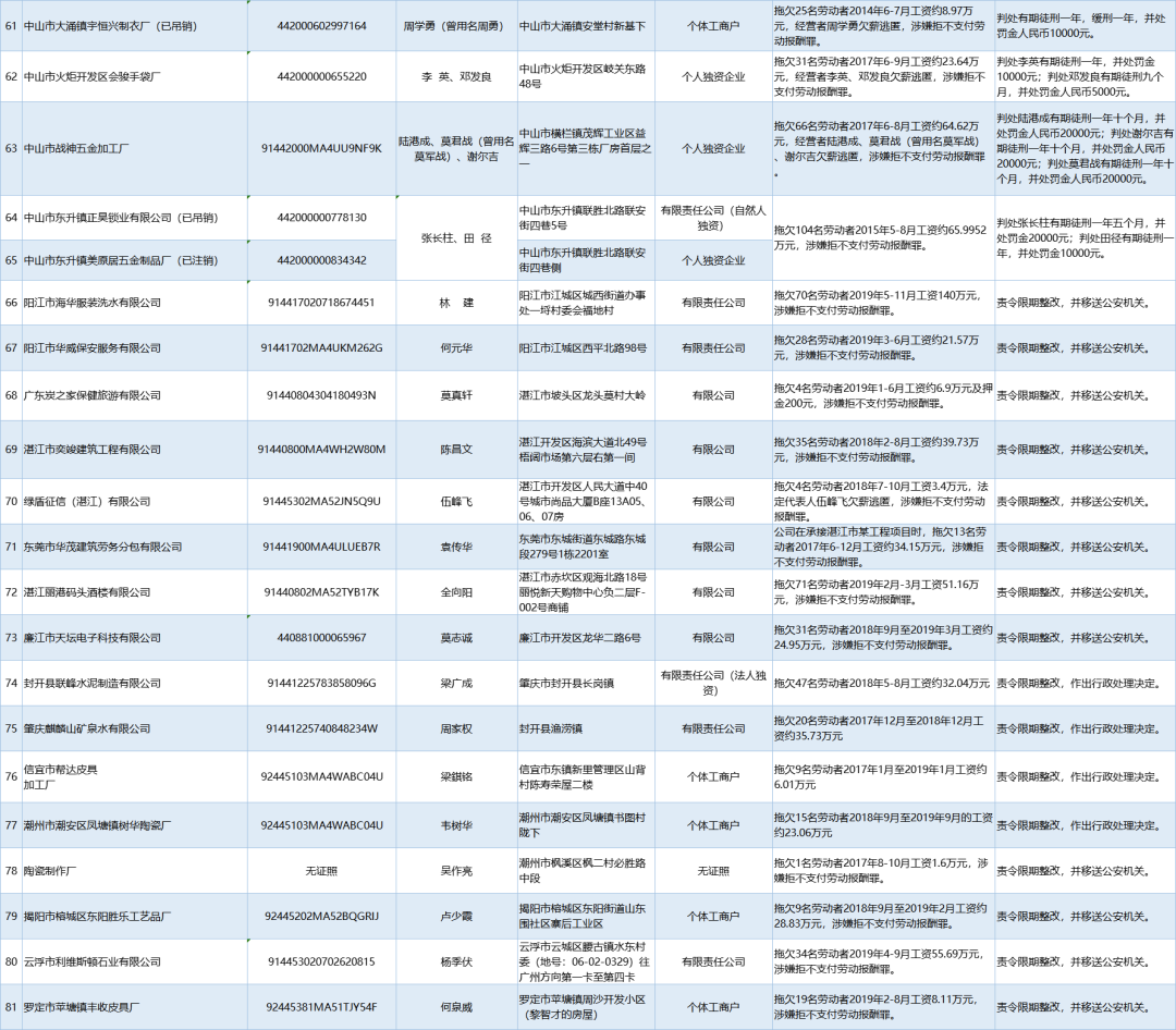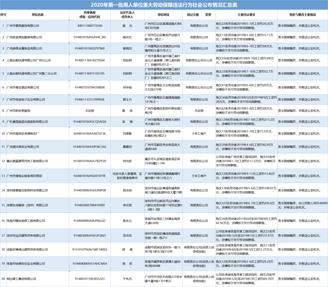 為加強(qiáng)對違法用人單位的社會監(jiān)督,強(qiáng)化誠信體系建設(shè),加大威懾力,依據(jù)《廣東省用人單位重大勞動保障違法行為社會公布暫行規(guī)定》,省人社廳公布2020年第一批重大違法案件,涉及81家企業(yè),其中深圳豬兼強(qiáng)互聯(lián)網(wǎng)科技有限公司拖欠138名勞動者2019年5-6月工資約100.01萬元,涉嫌拒不支付勞動報酬罪,被責(zé)令限期整改,并移送公安機(jī)關(guān)。深港東成睡袋(深圳)有限公司拖欠327名勞動者2019年6-7月工資約295.8萬元,涉嫌拒不支付勞動報酬罪,被責(zé)令限期整改,處以罰款人民幣4萬元,并移送公安機(jī)關(guān)。