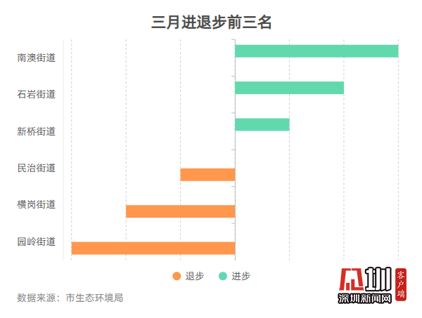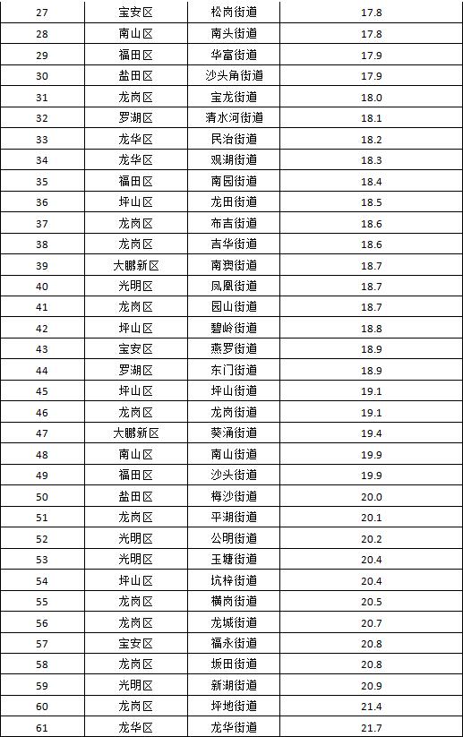空氣質(zhì)量排名前十的街道是:桃源街道、黃貝街道、南灣街道、南湖街道、東湖街道、蓮塘街道、蛇口街道、福保街道、海山街道和東曉街道;空氣質(zhì)量排名倒數(shù)十位的街道是:馬田街道、新安街道、觀瀾街道、筍崗街道、園嶺街道、福城街道、沙井街道、沙河街道、華強(qiáng)北街道和大浪街道。
