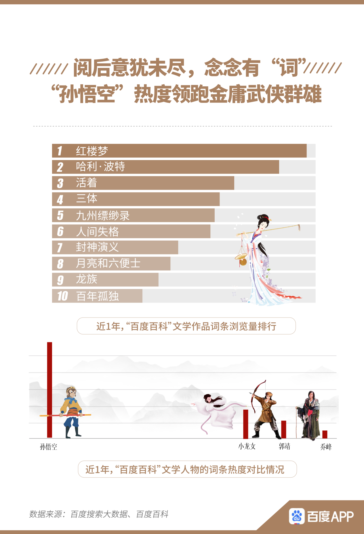 而百度百科的數(shù)據(jù)表明,人們在閱讀經(jīng)典書籍后,點(diǎn)擊詞條查看更多背景、釋義也是常態(tài)。《紅樓夢》、《哈利·波特》、《活著》、《三體》是近1年來網(wǎng)友在百度百科瀏覽較多的文學(xué)作品相關(guān)詞條。