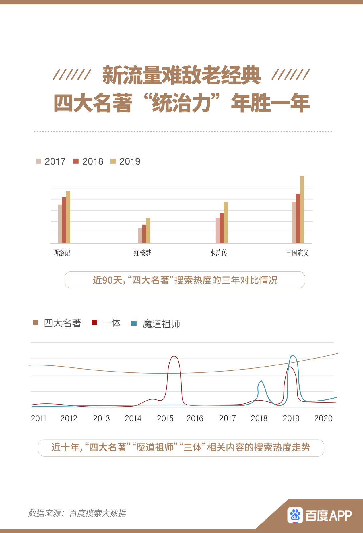 報告指出,近90天,“四大名著”搜索熱度的三年對比情況呈現(xiàn)出年年上升的趨勢,對比如《三體》、《魔道祖師》等近年的熱門書籍,四大名著搜索熱度走勢更加穩(wěn)定向上,體現(xiàn)出強(qiáng)大的“統(tǒng)治力”。
