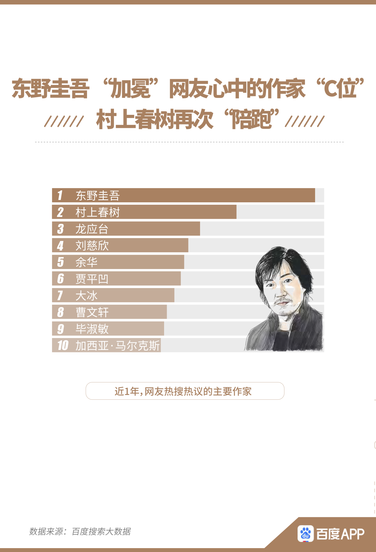 經(jīng)典深入人心,也無礙閱讀世界百家爭鳴。報告盤點(diǎn)了近1年網(wǎng)友熱搜熱議的主要作家,推理小說家東野圭吾占熱度C位,村上春樹位居第二,再“陪跑”。