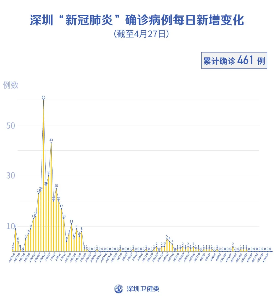 截至4月27日24時,深圳累計報告新冠肺炎病例461例。4月27日當天新增無癥狀感染者1例,出院1例。