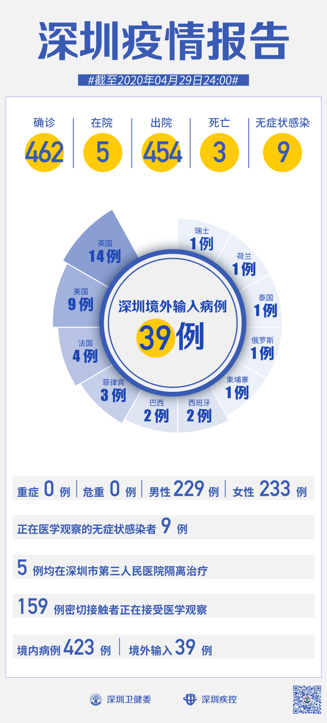 截至4月29日24時(shí),深圳累計(jì)報(bào)告新冠肺炎病例462例。4月29日當(dāng)天新增出院3例。
