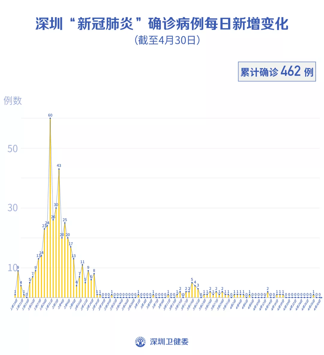 截至4月30日24時,深圳累計(jì)報(bào)告新冠肺炎病例462例。4月30日當(dāng)天新增無癥狀感染者2例,出院1例。