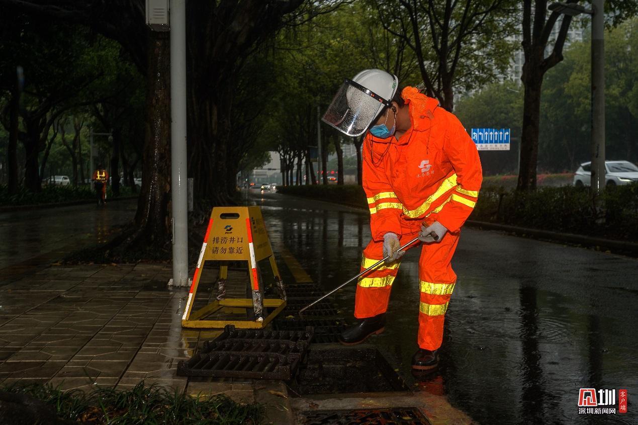 福田分公司員工殷海峰,正打開(kāi)雨水篦子加速排水。