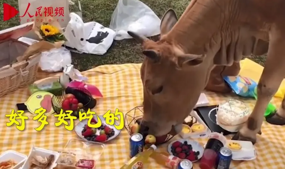 最近福建福清的幾位同學(xué)吭哧吭哧爬了一個小時(shí)的山,在草地上剛鋪好餐布擺完食物,正準(zhǔn)備拍照時(shí),來了一頭牛……