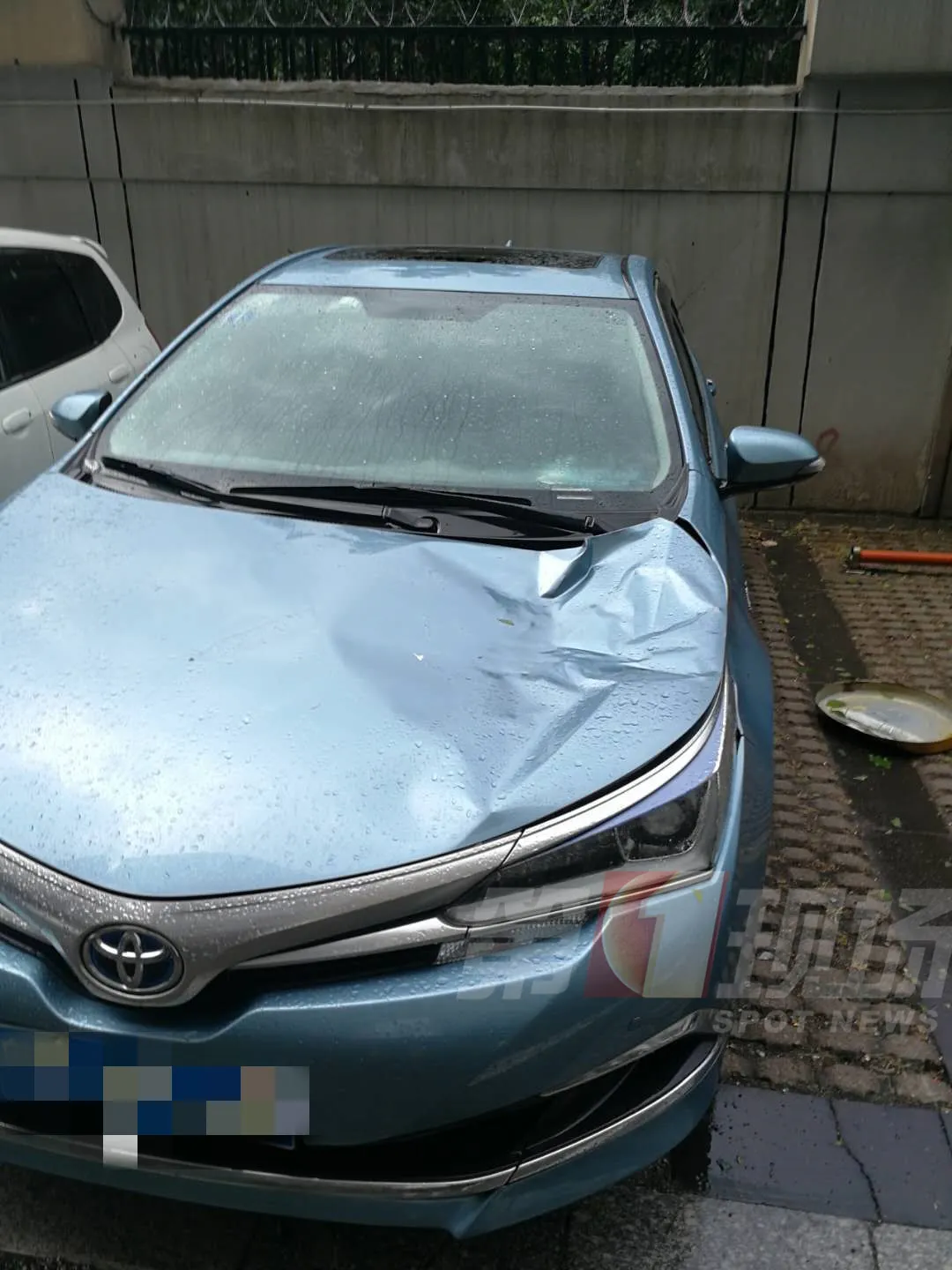 其中,龍華民治春華四季園42棟高層的儲水箱,砸到了樓下藍(lán)色轎車,造成車輛發(fā)動機(jī)蓋一處凹陷,多處刮痕。