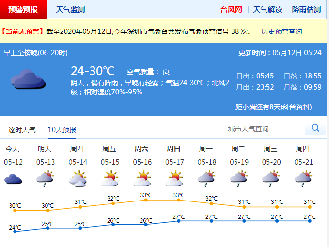見圳客戶端·深圳新聞網(wǎng)2020年5月12日訊 深圳昨夜雷電+大風(fēng)黃色+暴雨黃色預(yù)警齊生效,市氣象臺于2020年05月11日23時(shí)30分在全市取消暴雨黃色、大風(fēng)黃色預(yù)警。預(yù)計(jì)12日白天多云間陰天,有陣雨。13日陣雨轉(zhuǎn)多云,天況逐漸轉(zhuǎn)好,14-17日多云為主,陽光充足,天氣再趨炎熱。
