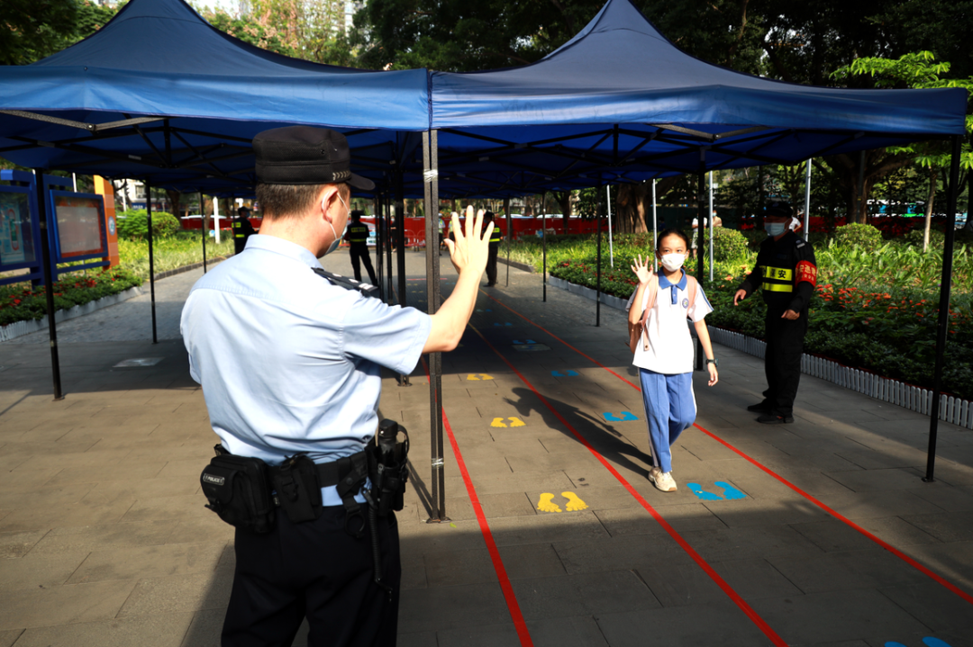 綠樹陰濃夏日長(zhǎng),恰是讀書好時(shí)節(jié)。5月11日,深圳市第二批學(xué)生返校復(fù)課。按照深圳市公安局和福田區(qū)委區(qū)政府關(guān)于復(fù)學(xué)復(fù)課的部署要求,深圳市公安局福田分局全面開啟“護(hù)學(xué)模式”,做實(shí)做細(xì)各項(xiàng)防控舉措,為福田學(xué)子們營(yíng)造安全有序的開學(xué)環(huán)境,全力護(hù)航校園安全。據(jù)統(tǒng)計(jì),5月11日,福田公安分局共出動(dòng)警力870人次,發(fā)動(dòng)保安員1105人次、護(hù)學(xué)崗力量953人次,保障全區(qū)105所學(xué)校,10.6萬名學(xué)生安全返校復(fù)課。