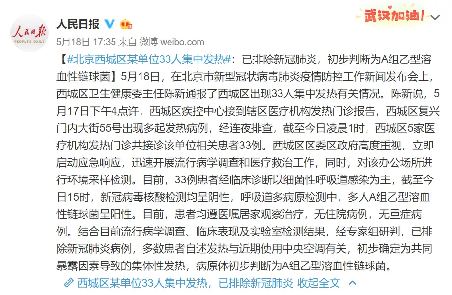 目前,33例患者經(jīng)臨床診斷以細(xì)菌性呼吸道感染為主,截至5月18日15時,新冠病毒核酸檢測均呈陰性,呼吸道多病原檢測中,多人A組乙型溶血性鏈球菌呈陽性。