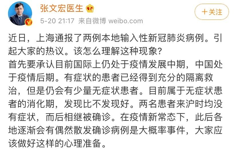 近日,上海通報了兩例本地輸入性新冠肺炎病例。20日晚間,上海新冠肺炎醫(yī)療救治組組長、復旦大學附屬華山醫(yī)院感染科主任張文宏發(fā)布微博稱,兩名患者來滬時均沒有癥狀,而后相繼被確診。