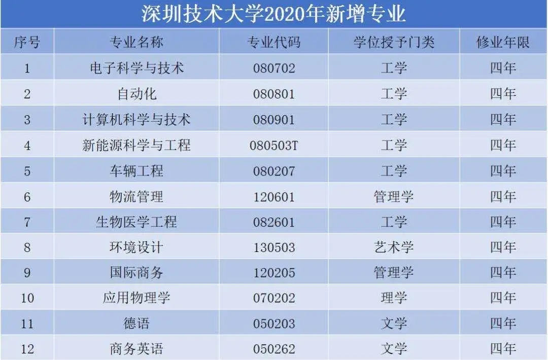 據(jù)教育部2019年本科專業(yè)備案和審批結(jié)果,在2019年機(jī)械設(shè)計(jì)制造及其自動化、物聯(lián)網(wǎng)工程、光源與照明、交通運(yùn)輸、汽車服務(wù)工程、工業(yè)設(shè)計(jì)等6個專業(yè)的基礎(chǔ)上,2020年,深圳技術(shù)大學(xué)將新增12個專業(yè),屆時招生專業(yè)將達(dá)18個。