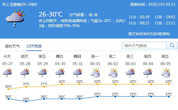 市氣象臺預(yù)測,27日-31日多云天氣為主,部分時間有陣雨或雷陣雨,氣溫逐日升高,天氣轉(zhuǎn)熱。27日多云間陰天,有陣雨或雷陣雨;氣溫26-30℃;北風(fēng)2-3級;相對濕度70%-95%。28-31日多云,可見陽光,部分時間有(雷)陣雨。6月1-2日多云,局地有短時陣雨。