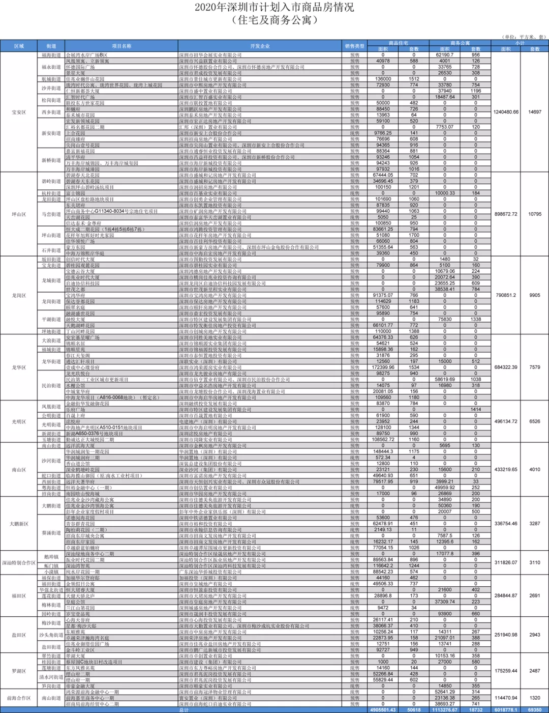 消息報記者在此次公布的《2020年深圳市計劃入市商品房情況 (住宅及商務(wù)公寓)》中看到,2020年南山區(qū)共有12個項目入市,累計供應(yīng)面積達到547690.59平米,供應(yīng)套數(shù)5330。