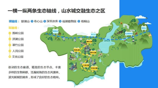 從橫軸線看羅湖,有銀湖山—布心山—深圳水庫(kù)—仙湖植物園—梧桐山;從縱軸線看羅湖,有圍嶺公園—洪湖公園—翠竹公園—人民公園—文化公園。躍動(dòng)的生態(tài)廊道、精致的生態(tài)節(jié)點(diǎn)、豐富多樣的生物種群、浩瀚如海的生態(tài)風(fēng)景林、波光粼粼的湖庫(kù),形成了良好的生態(tài)格局。