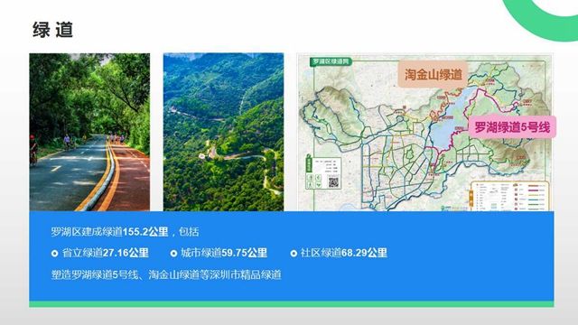 羅湖區(qū)建成綠道155.2公里,包括省立綠道、城市綠道、社區(qū)綠道等,塑造了羅湖綠道5號(hào)線、淘金山綠道等深圳市精品綠道。羅湖綠道5號(hào)線是融山水、休閑、生態(tài)和文化于一體的特色精品綠道,全線共分為山水休閑線、果林野趣線、河濱沁爽線三段,依山傍水而建,有效融合沿線自然景觀和人文景觀,把城市生活引入山水美景,使自然風(fēng)光更加貼近市民生活,形成“一路山水、一路文化”、獨(dú)具羅湖特色的風(fēng)景線。被市民譽(yù)為“深圳最美綠道”。