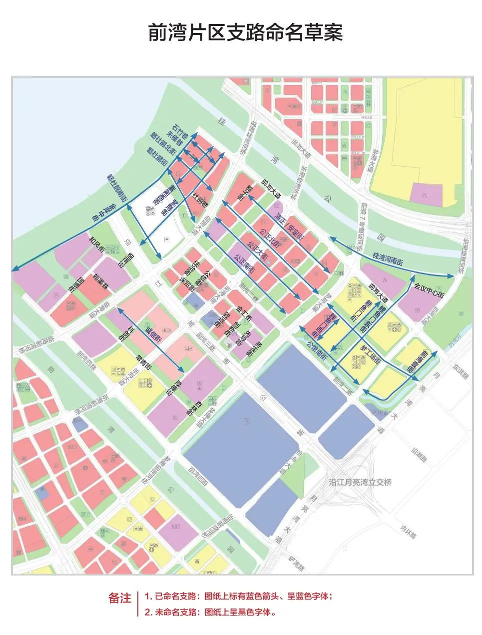 本次命名草案按照相關(guān)法規(guī)文件,結(jié)合前海桂灣、前灣、媽灣各片區(qū)的規(guī)劃定位、功能布局以及建設(shè)情況,針對(duì)三大片區(qū)和重要功能區(qū)功能、項(xiàng)目布局等特征,對(duì)前海15平方公里支路進(jìn)行了全覆蓋命名。