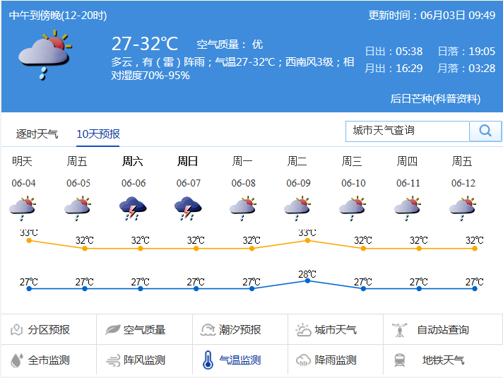 市氣象臺預(yù)測,3-4日多云,有雷陣雨,局部雨勢較大,3日氣溫27-32℃,天氣悶熱;5-7日降雨加大,有雷陣雨,局部暴雨,伴有雷暴和8級左右短時大風(fēng)。