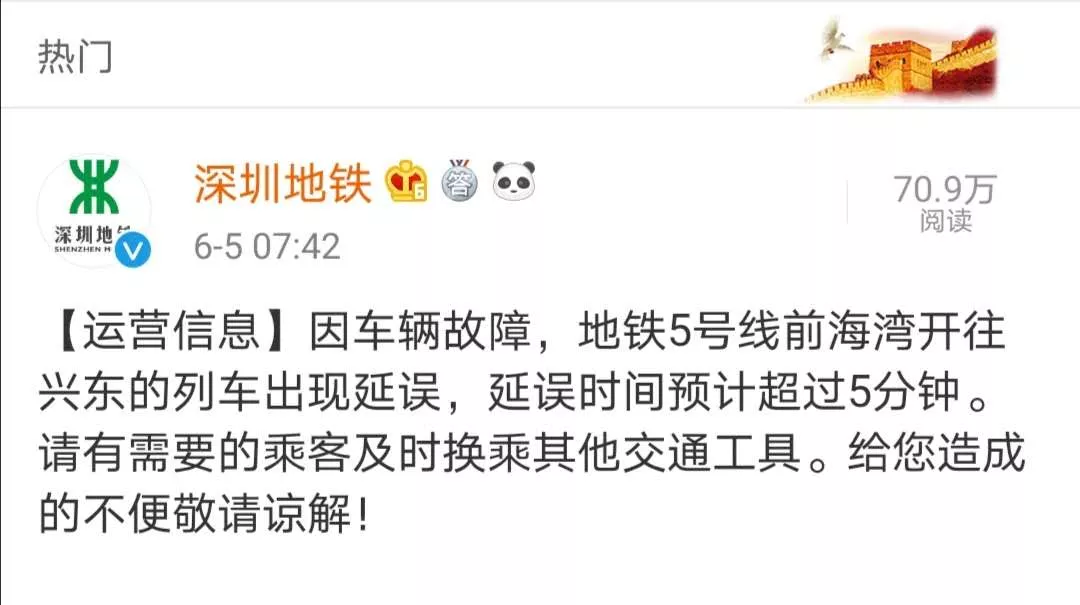 見(jiàn)圳客戶端·深圳新聞網(wǎng)2020年6月5日訊 今早7點(diǎn)42分深圳地鐵官方微博發(fā)布公告:因車輛故障,地鐵5號(hào)線前海灣開往興東的列車出現(xiàn)延誤,延誤時(shí)間預(yù)計(jì)超過(guò)5分鐘。