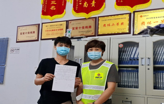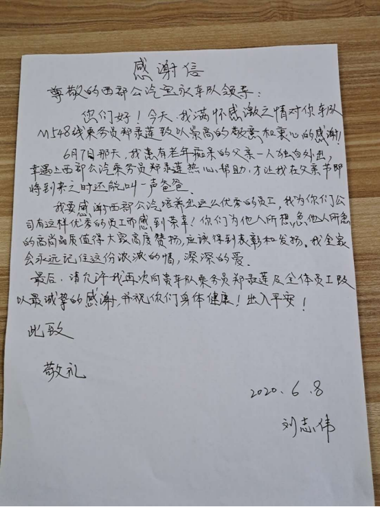 見圳客戶端·深圳新聞網(wǎng)2020年6月9日訊(深圳特區(qū)報(bào)記者 徐興東)6月9日早上,一位自稱劉先生的年輕人冒著滂沱大雨來到了西部公汽寶永車隊(duì)。一進(jìn)辦公室,劉先生雙手捧著將親筆寫的一封感謝信呈給了隊(duì)助張喜鳳,并深有感觸地說道:“多災(zāi)多難的父親有幸遇到乘務(wù)員鄭錄蓮的熱心幫助,并想方設(shè)法聯(lián)系上我。謝謝你們的成全,才讓我在父親節(jié)即將到來之時(shí)還能叫一聲爸爸,我將終生銘記諸位的大恩大德!”樸實(shí)無華的話語,感染了在場(chǎng)的每一個(gè)人,分明看出個(gè)個(gè)眼里都閃爍著晶瑩的喜悅淚花。
