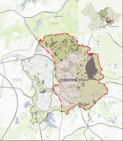 光明科學(xué)城北起深莞邊界,東部和南部以光明區(qū)轄區(qū)為界,西部以龍大高速和東長路為界,規(guī)劃總面積99 平方公里。
