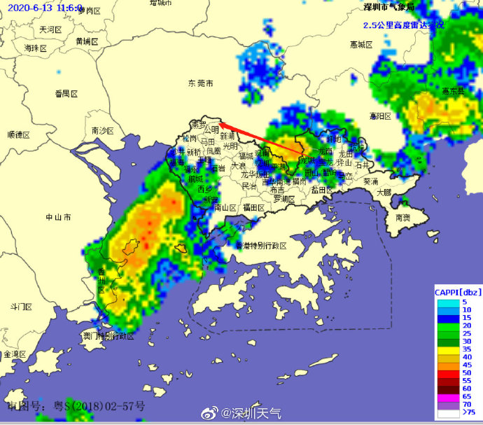 降雨云團(tuán)正在往西北方向移動(dòng),預(yù)計(jì)將會(huì)影響龍華、光明和寶安北部區(qū)域。