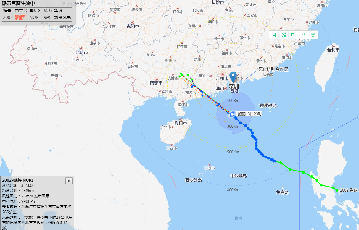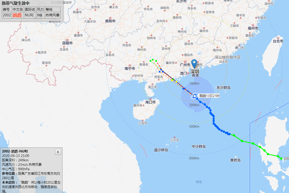 6月13日21時(shí)臺(tái)風(fēng)“鸚鵡”(熱帶風(fēng)暴級(jí))位于深圳市南方約249公里南海海面上,中心附近最大風(fēng)力9級(jí)。預(yù)計(jì)其將繼續(xù)向西北方向移動(dòng),趨向江門至茂名附近海域,最大可能14日上午以強(qiáng)熱帶風(fēng)暴級(jí)在陽江附近登陸。13日夜間起沿海海區(qū)及深汕區(qū)風(fēng)力逐漸加大,最大風(fēng)力6-7級(jí),最大陣風(fēng)8-10級(jí);14日0時(shí)至17時(shí)有大雨到暴雨,14日夜間起降雨明顯減弱。目前臺(tái)風(fēng)藍(lán)色、海浪藍(lán)色和雷電預(yù)警信號(hào)生效中。